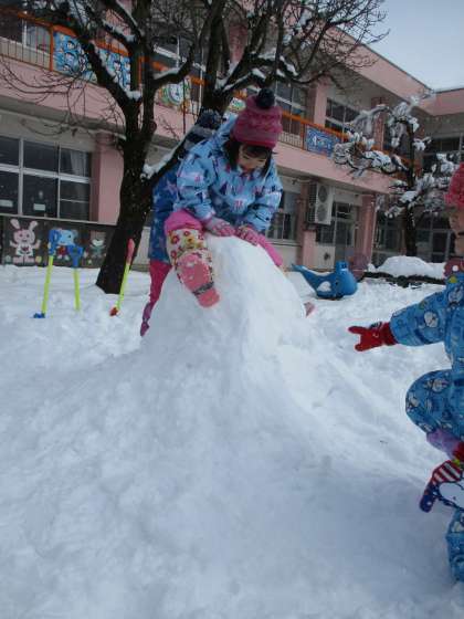 雪を高く積み上げ、固めると「滑り台になったよ」「跳び箱みたいだね」と言いながら思い思いに滑ったり跳んだりして遊びました。自然と「がんばれ」と声を掛け合う姿も見られ微笑ましかったです。