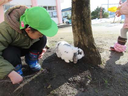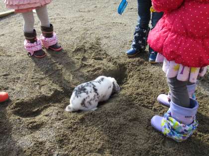 あんなにたくさんあった園庭の雪も減り、いいお天気になったので戸外で遊びました。残っている雪を使って型抜きをしたりミニ雪だるまを作ったり、砂遊びをしたりしました。散歩中のモコちゃんが、穴を掘っている姿を見たある友達は「モコちゃんがもっと掘れるように」と砂場にモコちゃんの体の大きさほどの穴を掘っていました。しばらくすると・・・まるでその話を聞いていたかのように、モコちゃんがスポッと入り込みました。