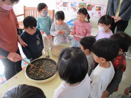 今日は節分で登園した時から大豆を煎っていると、だんだんと園の中が大豆のいい匂いでいっぱいに!子供たちも大豆の匂いに誘われて集まりました。子供たちは大豆を煎る様子を見て豆が割れたことにも気づき興味深そうに見ていました。