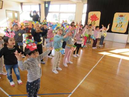 遊戯室では節分の豆まき会をしました。鬼のお面をかぶり、豆入れを持って集まり、豆まき会では節分の由来を聞いたり、歌を歌ったりしました。心の中の鬼を退治しようとする子供たちの元気な声が響きました。