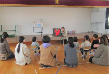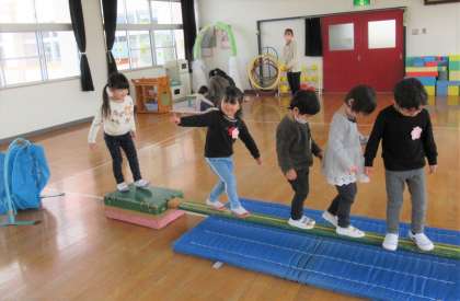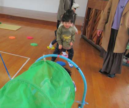 サーキットで遊んだ後は、一緒に踊ったり、朝の会にも参加したりしました。お名前呼びでは、ドキドキしながらも「はい」と可愛い返事が聞かれたり、手を少し挙げて見せたりと様々でしたよ。もも組さんと一緒に歌を歌ったり手遊びをしたりするときには、体を揺らしたり、笑顔も見られ楽しんで参加している姿が印象的でした。もも組さんは部屋に戻ると「一緒に遊べて楽しかった」「どきどきしたけど、大きな声で歌うたえたよ」と満足そうでしたよ。来年度、4月から一緒にたくさん遊べるのを楽しみに待っています♪