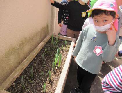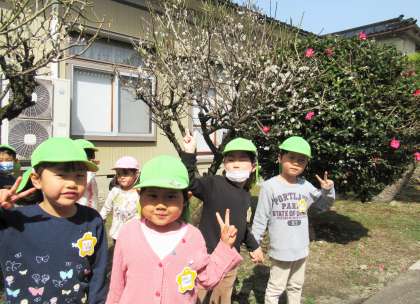 一日、一日春めいた気候になり、嬉しくなりますね。昨日は、もも組とうさぎ組で散歩に行き、春さがしをしてきました。梅の花や花壇のチューリップの芽、道端の小花を見つけると「わぁ、かわいい〜」「いいにおいだね」と、花を近くで見たり匂いを嗅いだりして嬉しそうな子供たちでした。これからは、春さがしがたくさん出来そうで楽しみです。