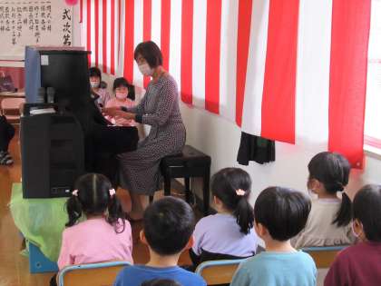 今日は、年長組が年少だった頃、お世話になった先生が修了のお祝いに来てくださいました。ピアノが得意で当時もよく弾いてくださったのですが、今日のお祝いの2曲に子供たちも大喜びでした。きれいな音色にうっとり…嬉しい音楽会となりました。年長組さんにとっては、嬉しい再会でしたね!