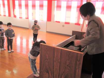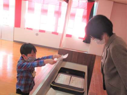 今日は3・4歳児の修了式がありました。名前が呼ばれると、大きな声で返事をし、園長先生から修了証書をいただきました。ばら組さんの修了証書をもらう姿をよく見ていた子供たちは、お辞儀をしながら「ありがとうございます」とかっこよくもらっていましたよ。堂々とした姿に頼もしさを感じました。