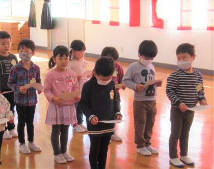 毎日幼稚園を楽しみに元気に登園し、たくさん笑って仲良く過ごせましたね。明日から春休み。怪我に気を付けて過ごしてください。保護者のみなさま、1年間、本当にありがとうございました。