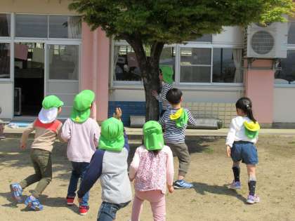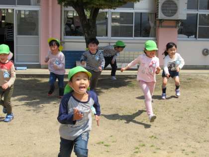 バナナ鬼と並んで大好きな遊びの一つに「だるまさんが転んだ」があります。回数を重ねていくたびに、逃げる側はどうしたら早く鬼のところで捕まっている友達を助けられるのか、動かないようにするためにはどのような姿勢がいいのかを考え、鬼側もまた、どうやったら動いている友達を捕まえられるのかを考え「だるまさんが転んだ」のフレーズを早く言ったり、逆に遅く言ったりと工夫していました。逃げる側に鬼がタッチされた直後に「ストップ」と言うタイミングも間髪入れずに言うので、なかなか遠くまで逃げられず残念にしているのかと思いきや自分も鬼がしたくて、タッチされることを喜んでいる子もいました。自分たちなりに工夫しながら遊びを進めていく姿にたくましさを感じていました。