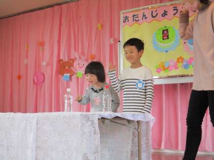 マジックショーでは、先生からたくさんのマジックがあり「ええ!どうして!」と驚く子供たちでした!4月生まれのお誕生日のお友達には、マジックのお手伝いをしてもらいました。水が入ったペットボトルが「チチンプイプイのプーイ!」でどうなったのか。また子供たちに話を聞いてみてください♪