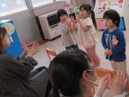 もも組さんは、入園して初めての保育参観。登園後から自分の身の回りのことをする姿や集まりで歌を歌ったり手遊びをしたりする姿を見ていただきました。お母さんたちに、園で遊んでいる遊びを見てもらったり一緒に遊んだりして子供たちは嬉しかったと思います。これからもたくさん友達と一緒に遊んで楽しい遊びを経験していきたいと思います。