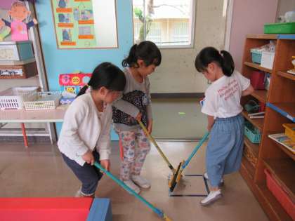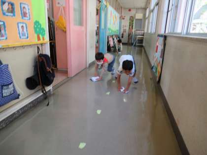 昨年度のばら組さんから当番を引き継ぎ「今度は自分たちがみんなのために」と毎日、張り切って当番の仕事をしています。3つのグループに分かれ、ウサギのもこちゃんのお世話、部屋の掃除、廊下掃除をしています。特に廊下掃除はばら組さんからもも組さんまでという長い距離を5回雑巾がけしています。途中でくじけそうになっても「頑張るぞ」と声を掛け合いながらしています。頼もしいばら組さんです。