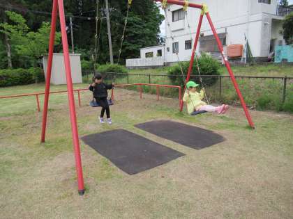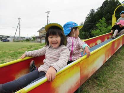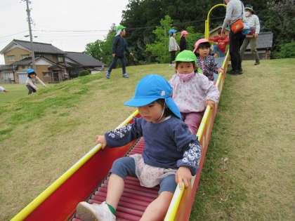 公園では、長い滑り台やブランコ、ターザンロープなどの固定遊具で遊んだり、鬼ごっこをしたりしました。遊んでいる途中で雨が…。急いで園に戻りました。今度はゆっくり遊んできましょうね。