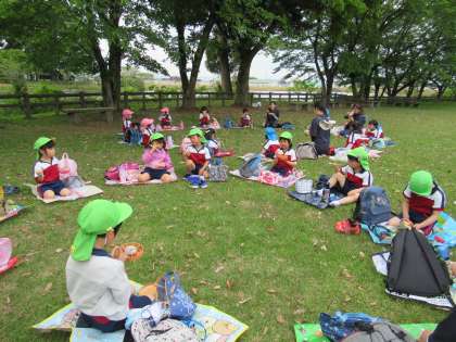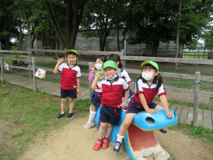 六せん広場でお弁当を食べました。たくさん歩いた後だったので、みんなのお腹はぺこぺこ。美味しいお弁当を食べると、元気がまた出てきたようです。お弁当の後は、広場でかけっこをしたり、動物遊具に乗って遊んだりしました。