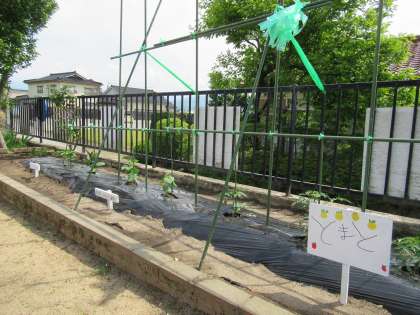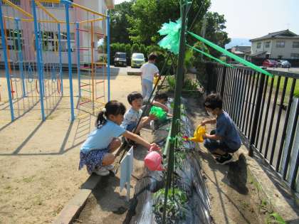 朝の涼しいうちにと、登園後すぐに野菜の水やりをしています。先日、野菜の看板づくりもし、さらに自分たちの野菜に愛着をもって育てるようになってきました。少しでも変化が見られると大はしゃぎ。楽しんで育てています。