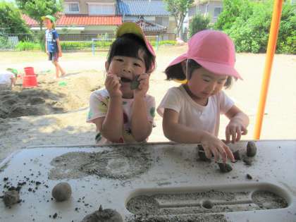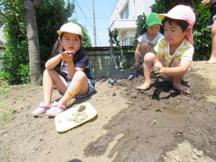 最近は、毎日泥んこ遊びをして楽しんでいます。昨日つくった泥団子が固くなっていることに気が付き「おひさま、温かかったからかな〜」と言いながら「クッキーですよ」と友達とおままごとをして遊んでいます。少し力を入れるとパカッと割れることも楽しいようです。昨日の続きで「違う形の泥団子つくってみよう」「私は、泥団子に砂糖(砂)付けて固めてみる!」「おひさまオーブンで固まれ〜」といろいろ試しています。