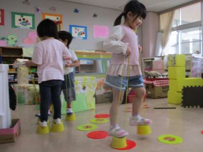 「バスが出発しますよ〜」と言う子供たちのかけ声が聞こえると、子供たちが集まってきます。「今日はどこにおでかけしますか」と聞くと「もこちゃんのところでお弁当食べよう」「キリンさんのところ」と一緒に出かけることを楽しんでいます。ぽっくりでキリンになって歩くことにも慣れてきました。