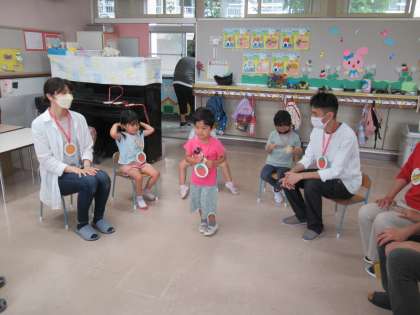今日は、保育参観ありました。昨日から「明日ママ来る!」「私はパパも来るよ!」ととても楽しみにしていた子供たちです。集まりでは、親子でペンギンになって歩いたり、お家の方が自分だけのブランコや鉄棒になって、楽しませてくれました。また、最近クラスでよく遊んでいる「ロンドン橋ゲーム」や「なんでもバスケット」も一緒にしました。みなさん参加してくださり、子供たちも嬉しそうでした。「パパの人!」「ママの人!」と今日だけの特別なお題が出たり「〇〇くんのパパ、2回目だね!がんばれ!」といろいろなお家の方と子供たちが関わり、楽しい時間を過ごすことができ、嬉しく思います。