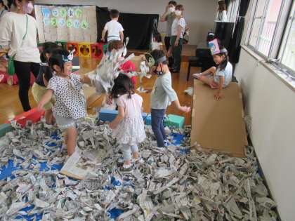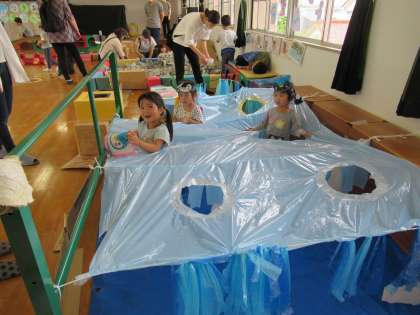 また「月岡ランド」では「お母さん、こっち来て!」といろいろな遊び場を回ったり、自分のつくったものを見せたりして、嬉しそうな子供たちでした。普段の楽しんでいる姿を見せることができ、嬉しく思います。今日は、お忙しい中、保育参観に来てくださり、ありがとうございました。