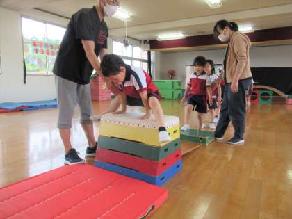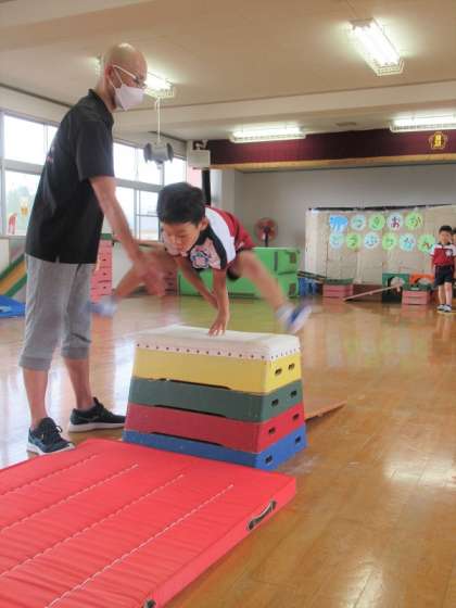 今日の体操教室は跳び箱でした。4段まで高くし、開脚跳びに挑戦しました。踏切板にしっかりグーの足で飛び込むと、高く跳べることを、先生のかっこいいお手本とともに教えていただき「おー!かっこいい!」と歓声が上がりました。繰り返し挑戦するごとに、大きく足を開くことが上手くなっていく子供たちでした。全員がいい表情で楽しそうに跳び箱に挑戦していましたよ。