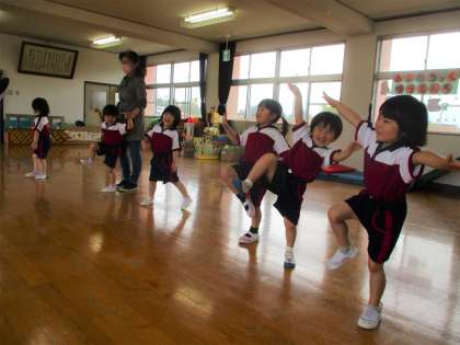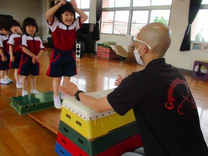 体操教室(もも組) 公開日 2022/06/14 更新日 2022/06/14 楽しい月岡幼稚園ニュース 6月14日(火) 今日は2回目の体操教室がありました。前回は見ていた子も、三鍋先生を見ながらリズムや準備体操の動きを真似ていました。みんなと一緒に体を動かす楽しさを感じています。今日は初めての跳び箱で、先生の話を聞き、巧技台の上かウサギジャンプ!両手を跳び箱に手を付いて足を開いて跳び箱に乗ります。足を開いて乗るところは難しいようでしたが繰り返すうちに意識して跳んでいるようでした。