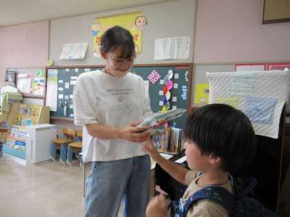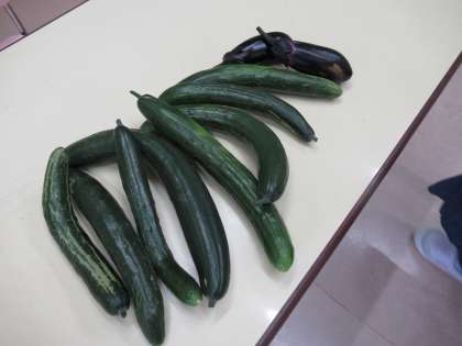 休みが明け、毎朝の日課で野菜を見に行った子供たち。「先生、きゅうりがすごいことになってる」と大きな声で知らせてくれました。「どうしたの」ときゅうりを見ると、大きく実ったきゅうりが8本。一度に獲れた野菜としては、今学期一番です。「すごいな」「休みの前は小さかったのに」と興奮気味。「先生たちにもあげれるね」と「きゅうりが大きくなったから食べてください」と言って渡していました。「ありがとう」と言われて「また、あげるね」と嬉しそうに話していました。