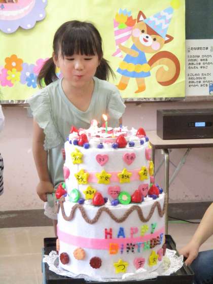 6月生まれの友達の誕生会がありました。ドキドキしながら名前を言ったり、友達から質問を聞いて答えたりしました。「釣りグミは食べたことありますか」という質問があり釣りグミの話題で盛り上がりました。