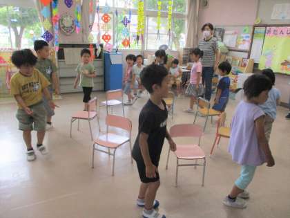 お楽しみコーナーでは、各年齢ごとに椅子取りゲームをしました。自然と「がんばれ〜!」と応援する姿があり、椅子に座ると喜び、最後まで残れず悔しがる子もいましたがみんなで楽しい時間を過ごしました。