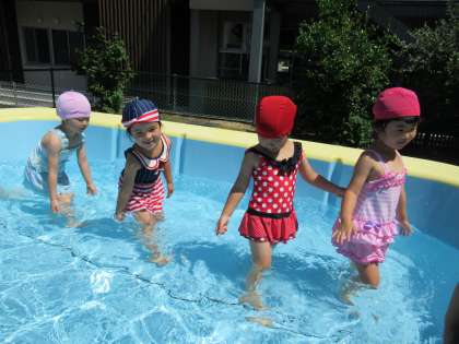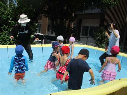 楽しみにしていたプールに入りました!プールの中を歩きながらだんだんと水に慣れていき、みんなで輪になりペンギン歩きをしたり、水しぶきが飛ぶほど大きく歩いたりしました。来週もたくさん遊びましょうね!