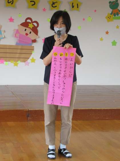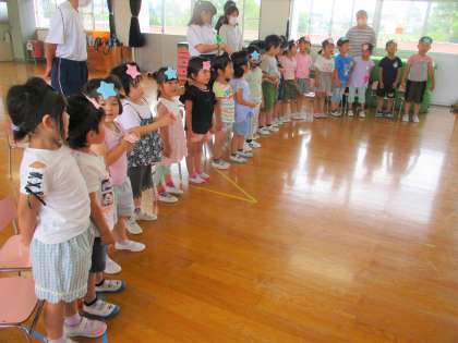 今日は「七夕の集い」がありました。みんなの願い事を紹介したり、七夕の歌を歌ったりしました。園長先生からは、月岡幼稚園の子供がすくすく育ってほしいことを願い、大きな短冊に書かれた願い事を紹介していただきました。「つきおか」の「つ」はつよい身体、「き」は基本的生活習慣を大切に、「お」は思いやりのある心で、「か」は考え工夫する子供になりますように。素敵なお兄さん、お姉さんになっていってほしいと願っています。