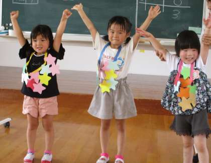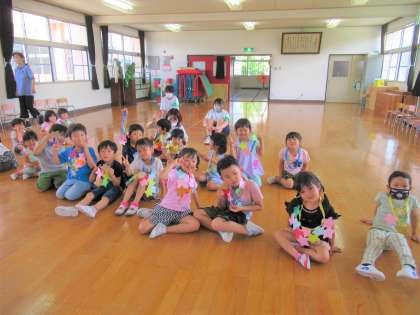 最後は「星の宝探しゲーム」をしました。幼稚園の遊戯室や保育室、廊下を使って、広い範囲で宝探しをしました。「金色の星ゲットするぞ!」「たくさんとるぞ!」と意気込み、みんな一生懸命に探していましたよ。最後は、クラスで1番星を取った子を紹介しました。みんな星をたくさん取れて嬉しそうでした。楽しい時間の後は、プールにも入り、楽しい時間を過ごしました。