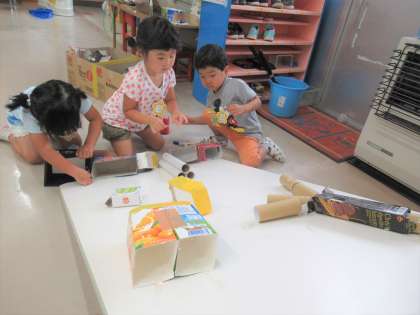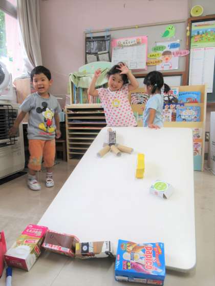 テーブルに廃材をくっつけて、ビー玉を転がして遊んでいます。トイレの芯を道にできることを知らせると「私、いいもの持ってるよ!」と家から持ってきたラップの芯をくっつけ、道が毎日少しずつ増えています。KちゃんとR君のアイディアで、〇×のゴールが増えると、遊びがまた盛り上がりました。自然と友達が集まり楽しんでいます。