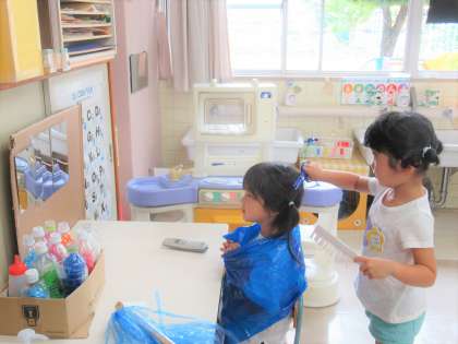 また、みつあみづくりを楽しんでいる子供たち。かばんをつくり、紐にして遊んでいましたが、今度は髪の毛をつくり始め、美容院ごっこが始まりました。「すみません、髪切ってくれませんか」「後ろの髪、もう少し切ってください」「分かりました。先にシャンプーしますね」と友達と楽しんでいます。