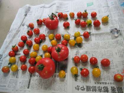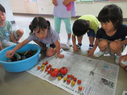 三連休明けの畑。野菜が大きくなって大変な騒ぎ。「キュウリがすっごく大きくなってる」「ピーマンもなすびもだよ」「トマトだって赤くなってる」と、みんなで声を掛け合いながら収穫しました。何と、トマトは60個!「やったね」「もう(収穫表の)シール貼るところがない」と嬉しい叫びでした。