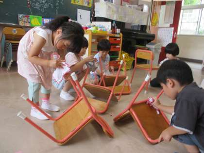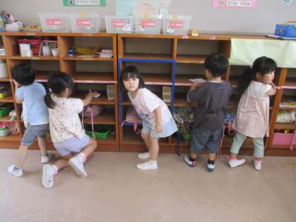1学期最後の日、子供たちと一緒に1学期間過ごしたもも組の掃除をしました。自分の道具箱の整頓をしたり、棚や椅子などを雑巾で拭いたりしました。掃除を進めていくと「ここも拭けばいいね」と汚れているところを見付けて拭いたり自分たちで雑巾を絞ろうとしたりする姿が見られ、真剣な表情で取り組んでいました。