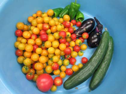 今日も朝の涼しいうちにと野菜の収穫。な・なんとトマトは156個収穫しました。そして、雪だるまのように2個くっついたトマトを発見しました。