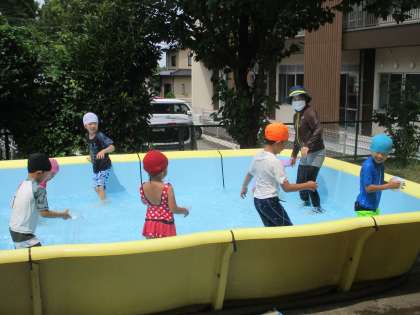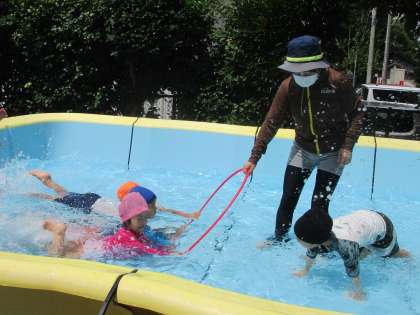 先日、最高気温が全国1位という暑さの日がありましたが、皆さんいかがお過ごしでしょうか。預かり保育に来ている子供たちは、元気いっぱいにプール遊びを楽しんでいます。プールの中でワニ歩きをしたり、フープにつながってバタ足したりして気持ちよさそうです。年長さんの中にはダイナミックに潜ったり泳いだりする子もいました。