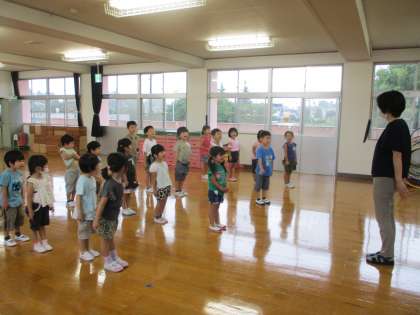 夏休みが終わり、今日は2学期の始業式がありました。元気に子供たちが登園し、嬉しく思います。遊戯室でみんなで運動会の体操や開会式などをしたり、各クラスでは夏休みの思い出を伝え合ったりしました。夏休みの思い出を思い出しながら話す姿からは笑みがこぼれ、楽しい経験ができたことが伝わりました。