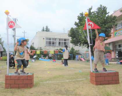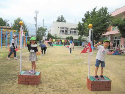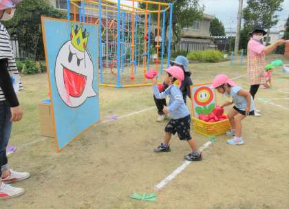 加技走は、子供たちがよく知っているマリオの世界で競技します。「マリオーカートみたい!」と嬉しそうな子供たちでした。テレサをやっつけるのに苦戦していましたが、どの子も一生懸命に玉を投げていました。これからたくさんする中で、どんどん上手になっていくのが楽しみです。何より加技走が楽しかったようで、終わった後に「あ〜たのしかった!」という声がたくさん聞かれました。今後も運動会に向けて、楽しく進めていけるように努めていきたいと思います。
