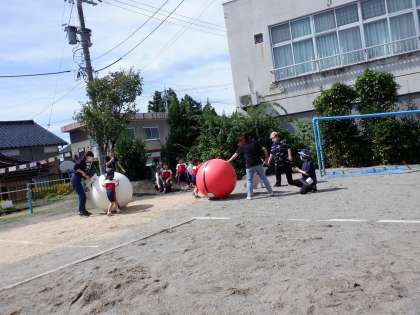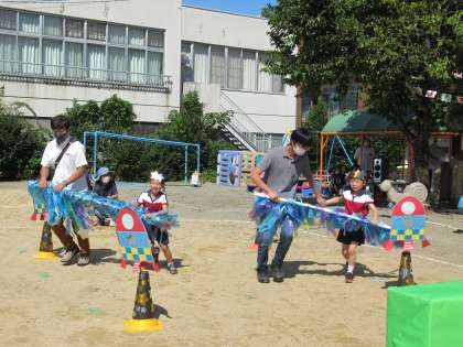 親子競技では、5歳児ばら組の「宇宙に向かってLet's Go!」では、酸素ボンベを背中に担いだ子供たちがお家の方と一緒に台風の目のようにクルクルとロケットの周りを回り、なかなか倒れない宇宙人を協力して倒す姿に応援の拍手が鳴り響きましたね。3歳児もも組、4歳児うさぎ組の「めざせ!月岡マスター☆」では、いろいろな方向に進んでしまう大玉の動きを親子で修正しながら運び、2人並んで「ポケモン、ゲットだぜ!」と元気よくポーズを決める姿がほほえましかったです。