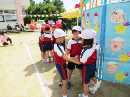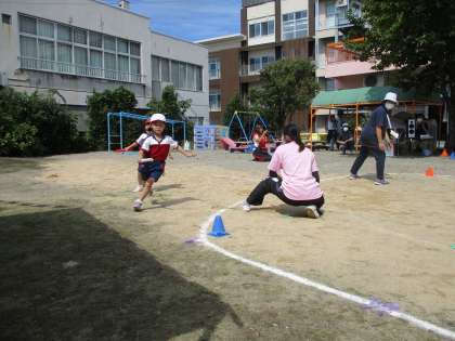 そして、運動会の最後を締めくくるのは5歳児ばら組のリレーです。今日もいつも通り、走順を赤組白組ごとに話し合って決めました。応援する側にも力が入ります。今日の結果は白組の勝ちでしたが、お互いに「頑張ったね」「今度は勝てるよ」と励まし合う姿に成長を感じました。