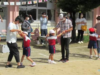 親子フォークダンスでは「シーシーチャオ」の曲に合わせて、お家の方と一緒に手をつないで踊りました。子供たちの中では誰と踊るか決めていたようです。親子での思い出がまた一つ増えたのではないでしょうか。閉会式では、園長先生から一人ずつメダルをいただき、キラキラと光るメダルを見つめていましたね。今日一日頑張ったみんなの方がキラキラと光り輝いていたように思います。いつも練習していた園庭でたくさんの方に見守られながら、安心して運動会ができたことと思います。たくさんの応援をありがとうございました。そして、保護者の皆様には、最後まで片付けのお手伝いをしていただき、感謝申し上げます。今日は、お家でたくさん褒めてあげてくださいね。そして、また火曜日。みんなを待っていますね。