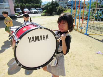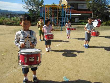 運動会が終わって「あの楽器もしてみたい」という声が上がり、鼓隊演奏のときに友達がしていた楽器と交替してすることにしました。今まで一緒にしてきたこともあって、隊形移動には戸惑いも見られましたが、他の楽器になってもリズムはバッチリでした!鼓隊演奏が終わった後に感想を聞くと「太鼓って重たかった」「他の楽器のリズムって難しいね」「やっぱり自分の楽器が一番」と話してました。