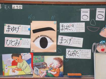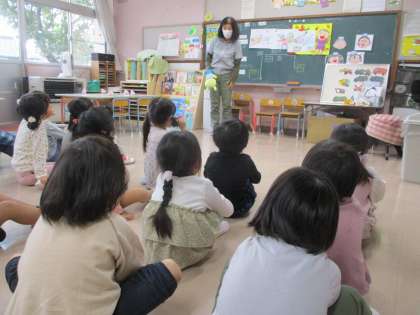 保健指導では“目”について話を聞きました。眉毛や睫毛、涙等がどんな働きをしているのかを聞き、汚れた手で目をこすらないこと、明るい場所で絵本をみようと約束しました。目を大切にしましょうね!