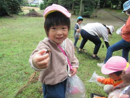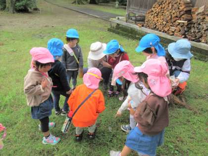 コオロギの他にも、ミノムシやカマキリ、トカゲ等、いろいろな虫を見付けました。捕まえたコオロギは、園に持ち帰り、図鑑で育て方を調べました。虫の声を聞くことを楽しみながら、育てていこうと思います。
