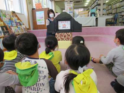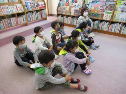 今月も楽しみにしていた図書館指導へ出かけました。季節に合わせた読み聞かせをしてくださって、子供たちも毎回ワクワクしながら見ています。なかなか絵本が選べなくて、いくつも見てじっくり決める子、手に取ってすぐに決める子と様々で、借りた本を早く読みたくて仕方ない様子でした。