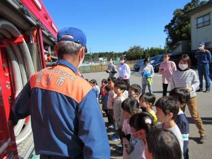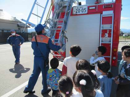 毎月行っている避難訓練ですが、今月は富山市南部消防署の方に来ていただいて訓練の様子を見ていただきました。「お・は・し・も」の約束、火災の時の避難方法、火遊びをしないことを約束しました。訓練後は、消防車両の見学もさせていただき、放水時に使うホースを持たせてもらって「重いよ」「こんなの持てるって、消防士さんってすごいね」と話していました。中には「大きくなったら消防士さんになりたい」と言っている子もいました。