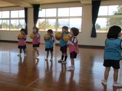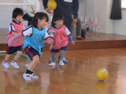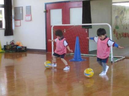 今日は保育参観がありました。普段の遊びではお母さんたちに見られていることで緊張していましたね。サッカー教室では足を使ってボールと仲良くなることを教わりました。最後は試合をして1つのボールを元気に追いかけ、シュートが決まり喜びました!