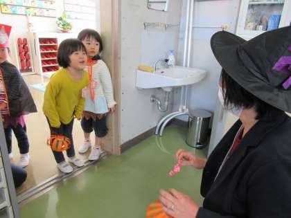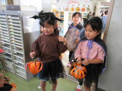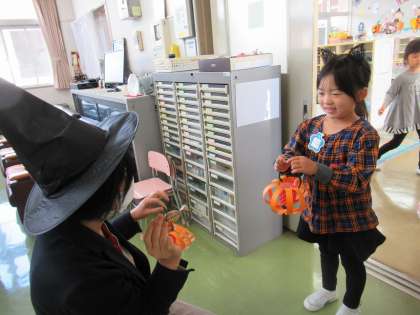 トリック・オア・トリート(全園児) 公開日 2022/10/27 更新日 2022/10/27 楽しい月岡幼稚園ニュース 10月27日(木) みんなでお揃いのかぼちゃバックをつくり、園長先生のところへ。最初は恥ずかしくてなかなか呪文を言えなかった子も友達と一緒に言ったり、言葉を教えてもらったりしながら少しずつ一人で言えるようになってきました。相手に言葉を伝えることは、勇気がいることですが大切なことです。この機会に自信をもって話せるようになってくれたらと願っています。