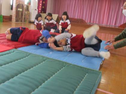 マットの「おいもゴロゴロ」では、マットからはみ出さないように体を使っていました。友達と一緒にした「おいもゴロゴロ」は、息を合わせて転がる姿も見られ成長を感じました。前転は三鍋先生に補助してもらった後は自分の力でも回りました。最後はマットの上に並び、マットの布団をかけてもらうと…ばら組、うさぎ組の子供たちが順番に走り抜け「楽しかった!」と痛みはなく、気持ちいいようでした。