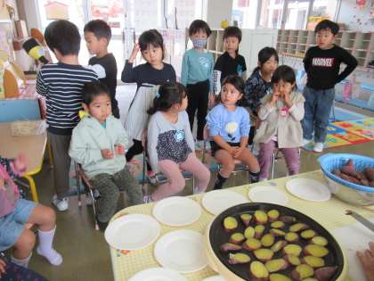 今日は以前みんなで掘ったサツマイモを、焼き芋にして食べました!ばら組さんがサツマイモを綺麗に洗ってくれた後、蒸かしたサツマイモをプレートにのせて焼き、熱々の焼き芋の完成☆ 焼いている間も「いい匂い〜」と匂いも楽しみました。食べるととっても甘かったようで「甘い!」「すごくおいしい!」とたくさんおかわりをしていましたよ。