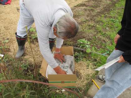 その後、園の近くで畑をしていて、いつも優しく何でも教えてくださる地域の方に、園のサツマイモがたくさん採れて美味しかったことを報告しに行きました。また、サツマイモを種芋にする方法も実演しながら丁寧に教えてもらいました。今日から種芋を大事に育てていきたいと思います。来年の夏頃には、たくさんの苗が育ってくれますように。