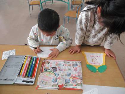 今日はサンタさんにお願いしたいプレゼントをそれぞれに考えました。そして、サンタさんが分かるように、プレゼントの絵を描き飾りました。絵が描き終わると、窓に向かって「サンタさん、お願いします。プレゼントがほしいです。」と真剣にお願いしており、可愛らしい姿にくすっと笑ってしまいました。いい子に待っていようね。